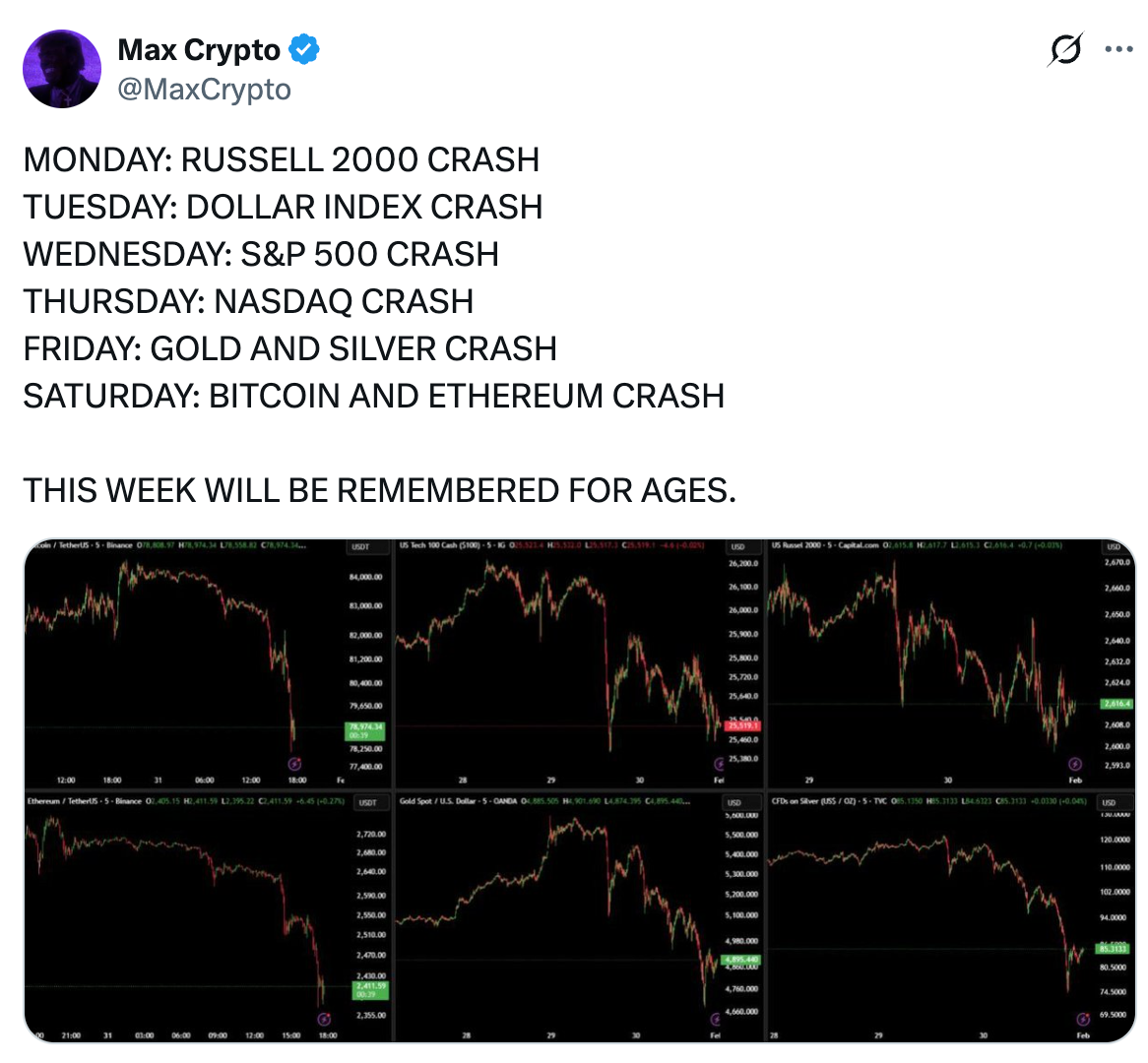 - A sharp escalation in U.S.-Iran tensions, a surging dollar after Kevin Warsh’s Fed nomination, and cascading forced liquidations have driven a broad sell-off across crypto, gold, silver and U.S. stock futures.