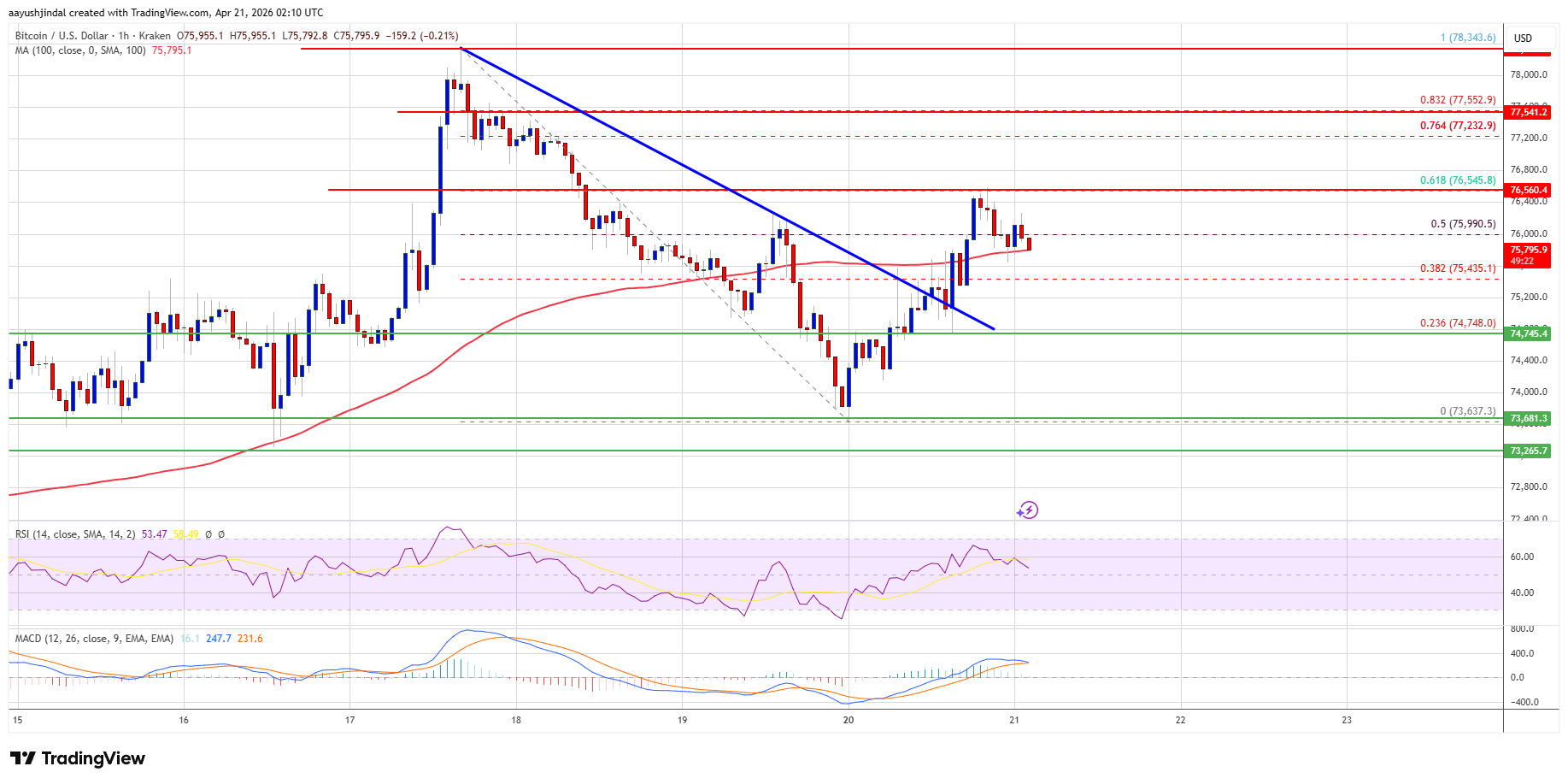 Bitcoin’s price recently climbed above $74,500 and $75,000. It also broke past a downward-trending resistance level around $75,200, as seen on an hourly chart. This pushed the price beyond the halfway point of its recent dip from a high of $78,344 to a low of $73,637.
