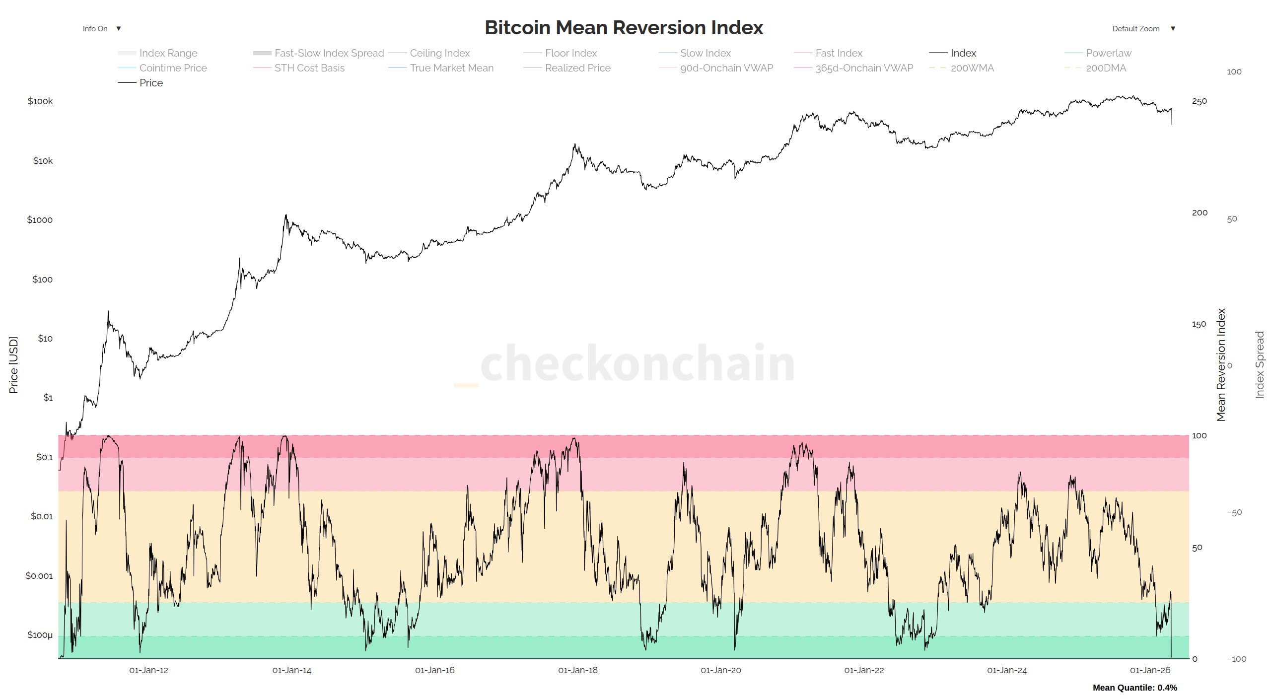 Addressing the bears, Check suggests their predictions deserve a closer, if somewhat amused, scrutiny. He points to the Bitcoin Mean Reversion Index, a composite model that averages multiple key valuation metrics, including the 200-week moving average, realized price, power law trend, and a number of volume-weighted average price measures. This index ranks bitcoin’s price on a historical percentile basis, a tool as intricate as it is indispensable.