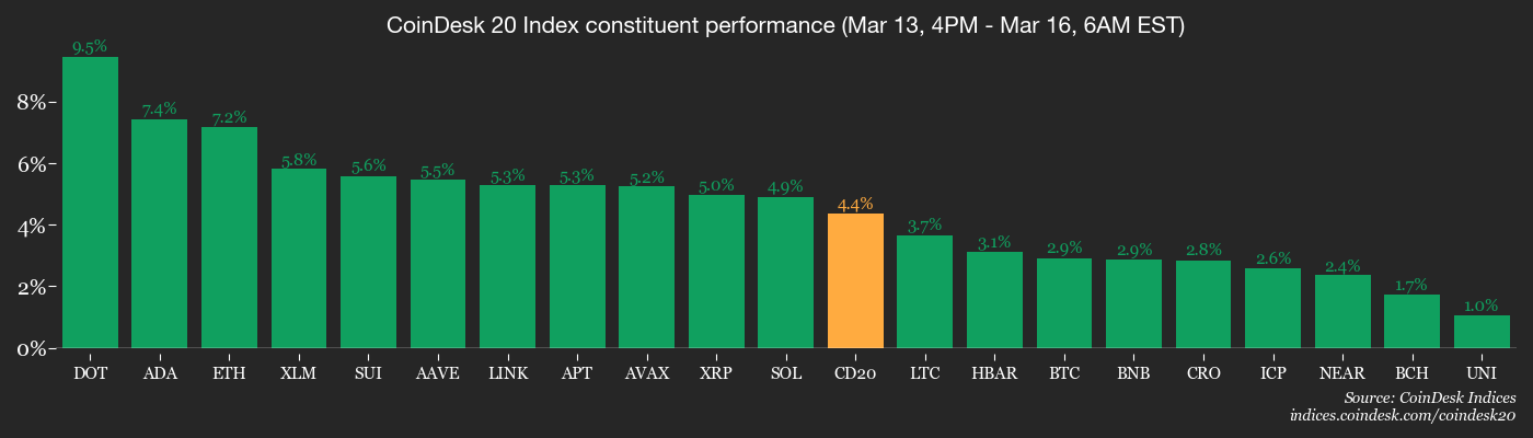 Bitcoin hopped over 2% in 24 hours, flirting briefly with $74,300-its first awkward appearance at that level since early February. XRP and Solana were like the overeager backup dancers, up 4%, and Ether strutted ahead with a 7% gain. The CoinDesk 20 Index decided to tag along with nearly 4% growth.