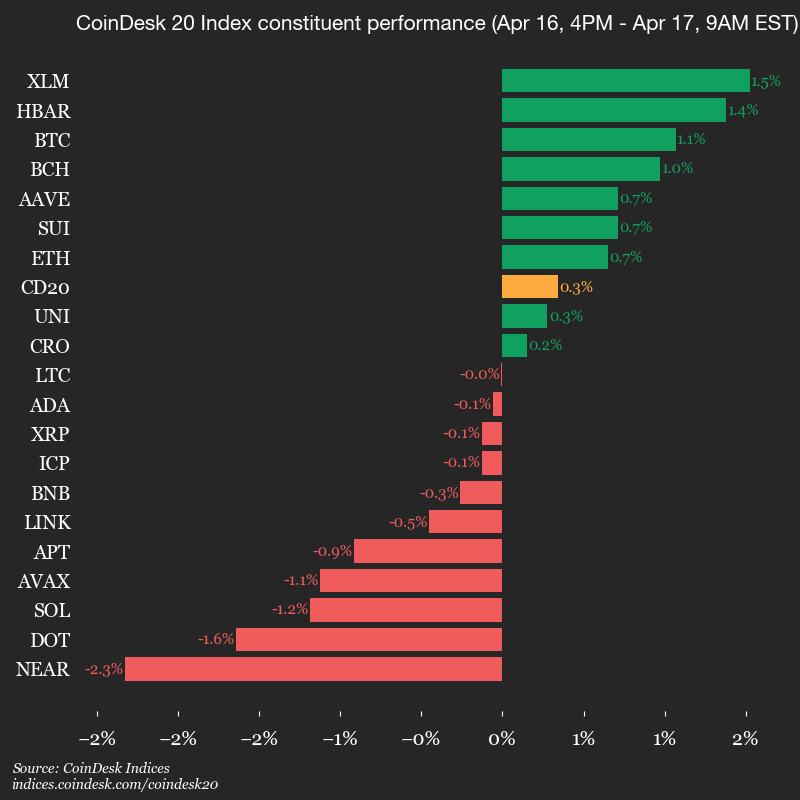 Leaders: XLM (+1.5%) and HBAR (+1.4%).